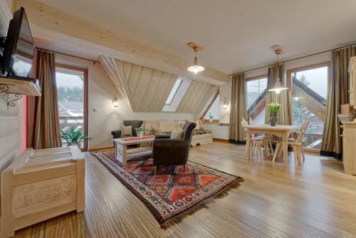 „Apartament ze zbójnickim przytupem i zapachem lasu” fascynuje unikalnym charakterem i oryginalnym wystrojem. Ręcznie wykonane meble, tkane kilimy i typowe dla Podhala zdobienia nadają mu niepowtarzalnego uroku.
